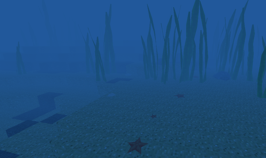 When moving in the water the underwater lighting, color, and visibility is based on the biome water settings and depth. For the ocean settings it shifts to a darker blue and then the light goes down to almost zero at the bottom. This could be set differently for other water bodies like the pristine lake or the fetid marsh examples.