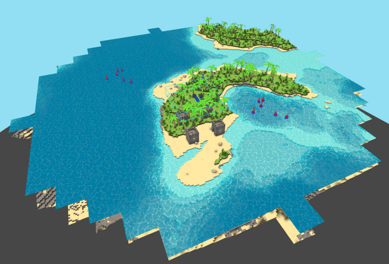 So I decided to go down the path of having two different types of detail model systems that are interchangeable. The existing system is kept for dynamic details where there must be a full model present. The standard details will contain the bulk of the details in the scene and be combined into a single mesh per chunk similar to the ground and the water (which is also blocky although not evident yet!).