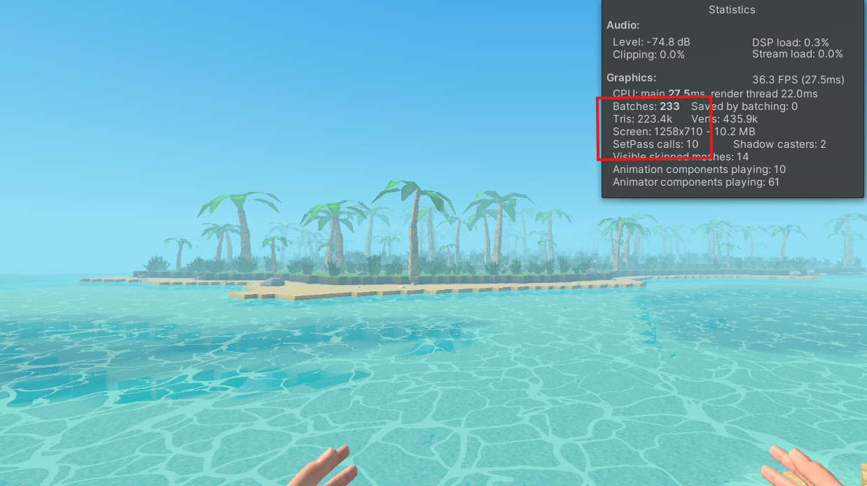 Just to be clear the SRP batcher is still integral to all this working. It batches together all the chunks (both block and detail meshes) and similarly batches the water meshes (they are transparent and use the water shader so are in a separate batch group). The big change is that the SRP batcher isn’t trying to reduce thousands of detail models and instead is handling hundreds between the chunk meshes and the other entity models (crates etc.) Just check out these Stats and batches in the Frame Debugger.